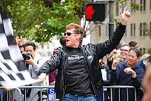 In 2015, he recorded the single "True Survivor", accompanied by a music video, which featured as the lead track for the 2015 Swedish short film Kung Fury.[69] The song was composed by Mitch Murder (Johan Bengtsson). Recorded in Sweden, the song and the video is designed as an ostentatious over-the-top 1980s homage/parody, with the video featuring dinosaurs, kung fu, Adolf Hitler, skateboarding, Norse Gods and time travelling. Hasselhoff claimed that he had received the offer to record the song and the video by a request from Sweden Universal to "sing a tribute to the '80s".[70] Hasselhoff performed a live version of the song during the 2016 Guldbagge Awards.[71][72] "True Survivor" debuted and peaked at number 94 on the Canadian Hot 100, becoming his first chart entry in Canada. In 2017, a retro music video called "Guardians' Inferno" was released as a bonus on the Guardians of the Galaxy Vol. 2 home release, where Hasselhoff does the singing.[73]