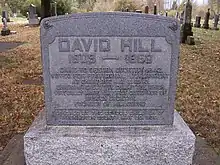 There are no known pictures or portraits of Hill. He was six feet one inch tall with black hair. Slim, with a sallow complexion.[3] On May 9, 1850, David Hill died of unknown causes. At the time he was still an active member of the legislature that was then in session. After the assembly of the two houses on Friday May 10, 1850 it was announced that Hon. David Hill had died the previous day, and "after adoption of the usual resolutions" all were adjourned until 10am the following Monday morning in observance.[18] Hill died without a will and his wife was appointed as administratrix of his estate with Robert and Michael Moore, and Ralph Wilcox as appraisers.[16]
