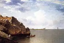 Johnson's greatest success was achieved during the mid-1870s, when he exhibited paintings of such popular landscape locales as the Catskills, Lake George and the White Mountains, as well as pastoral scenes of central New York state, an area which he was the only important artist of the era to frequent. He exhibited extensively in major American art centers, including Chicago, Boston and Philadelphia, and at the Paris Salon of 1877. Subsequently his work changed to reflect the influence of the French Barbizon school, a stylistic transition that met with harsh critical reception from his colleagues,[1] but which paralleled the dilemma faced by Hudson River school painters seeking to stay relevant as aesthetic tastes changed. Bayside, New Rochelle, New York (below) is an example of Johnson's later work, when the Barbizon influence eclipsed his earlier debt to the Hudson River school.[3]