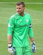 On 12 May 2009, following Norwich's relegation, Marshall signed for Championship side Cardiff City in a deal worth up to £500,000.[16][17] He was chosen as the first choice goalkeeper over Finland international Peter Enckelman by manager Dave Jones, making his debut on the opening day of the season in a 4–0 win over Scunthorpe United before conceding his first goal in a 1–1 draw with Blackpool in the following match. Marshall let in three goals in his first South Wales Derby where City went on to lose 3–2 to Swansea City at the Liberty Stadium. Marshall suffered an injury in a 2–1 loss against Ipswich Town, resulting in Peter Enckelman coming on for the last 45 minutes and two goals being scored.[18] Marhsall did recover in time for the next game, were Cardiff beat Preston North End 1–0. After his quick return Marshall kept three consecutive clean sheets the other two coming against West Bromwich Albion and Middlesbrough and also making 150th league appearance against Middlesbrough.