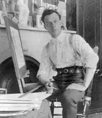 In New York, he spent two years (and a third year of night school) studying at the Art Students League. He had five paintings exhibited in the Armory Show of 1913, and he was also represented by the N. E. Montross Gallery (same as 'The Eight' or Ashcan School artists).[3] In 1912, he married Frances May (known as Patsy) and later they moved to Boston Corners, a small hamlet where Milne painted with oils and watercolours.[4] Milne left Boston Corners in 1917 for basic training in Toronto for World War I. He was stationed in Quebec and then quarantined in England for a month, during which time World War I ended. Because of his background as an artist, he was asked to complete paintings and drawings as a war artist. Milne produced artworks of battlefields in France and Belgium as well as of soldiers in Kinmel Park Camp in England.[5]