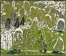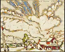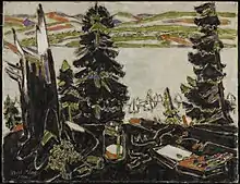 Between the years of 1919 and 1929, Milne lived in Boston Corners and the surrounding areas, focusing his artistic work on the landscape. He spent the winter of 1923–24 in Ottawa in hopes of finding government patronage and a position.[6] During his six months in the city, Milne produced several paintings and watercolours. Six of his works were purchased by the National Gallery of Canada. However, Milne was unable to secure a job in the federal government and returned to Upper New York State.[7] In 1929, Milne returned to Canada to paint in Temagami, Weston and Palgrave. He separated from his wife in 1933, moved to Port Severn, Ontario and sold many of his paintings to prominent art patrons Vincent Massey and Alice Massey.[8] In the late 1930s, Milne settled down in Uxbridge, Ontario with Kathleen Pavey, a nurse, and the two had a son (also David) in 1941. During the later years of his life, Milne worked again in watercolours, and changed his subject matter to more whimsical, fantasy and childlike inspirations. He continued to travel to Algonquin Park and Baptiste Lake to paint the Canadian landscape.[9]