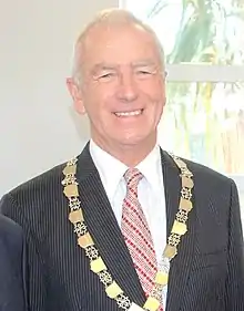 He returned to the City Council for a term from 1998 to 2001. In 2001 he was elected to the Hutt Valley District Health Board.[2] Ogden was first elected mayor in 2004, beating incumbent Mayor John Terris running on a pledge to reduce debt, limit rates and fix flooding problems. His campaign benefited greatly after Terris was hospitalised with blood poisoning at the start of the election campaign.[1] He was re-elected in 2007 with a reduced majority,[6] but was defeated in 2010 by sitting councillor Ray Wallace.[7][8]