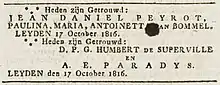 Humbert de Superville married Elisabeth Paradijs in 1816. They had two sons, one of whom died at a very young age; the other son died of typhoid at the age of 24.