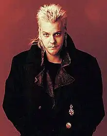David, and particularly his interactions with the character Michael,[10] has been read as homoerotic. Sutherland has nodded to these themes, remarking that the "whole scene where I catch [Michael] in the fog coming off the bridge ... I mean, it's a very sensual moment!"[11] Harry Benshoff in his book Monsters in the Closet: Homosexuality and the Horror Film states that with his bleach-blond hair, stubble, earrings and leather attire David appears as a gay pin-up model. He interprets the film as the story of the "normal" teen Michael being seduced by David's lifestyle.[12] Psychoanalyst Trevor C. Pederson describes David's attempts at recruiting Michael as "obsessive", noting that David even requests that Michael join him even after Michael and his friends have killed all of David's fellow vampires.[13][14][15][16][17]