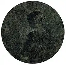 A painting titled "Phonio" by Irish artist David Quinn. Mixed media on circular panel, 100 cm diameter.