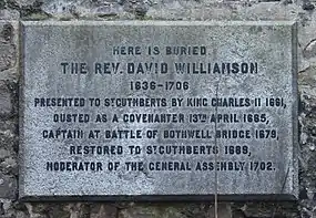 David Williamson (c. 1634[lower-alpha 1]–6 August 1706) was a Scottish minister and Covenanter who served as moderator of the General Assembly of the Church of Scotland in 1702. He is notable for his long association with Edinburgh's West Kirk, his seven marriages, and his portrayal in the traditional song "Dainty Davie".