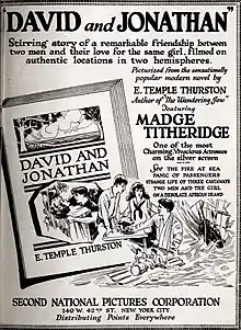 David and Jonathan is a 1920 British silent adventure film directed by Alexander Butler and starring Madge Titheradge, Geoffrey Webb, and Dick Ryan. It was based on a novel by E. Temple Thurston. It was made at Universal City in California.[2] Two men, David and Jonathan, are shipwrecked on a desert island together with a girl with whom they are both in love.