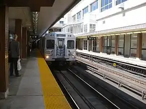 The station is on three levels: the entrances are located on street level, the concourse and collector booths are on the mezzanine (second) level, and the subway platforms are on the lower level.