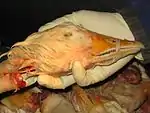 As their boats pass underneath, young men attempt to jump off and grab the goose (which has been coated in grease) and remove its head. To add to the challenge, spectators on either side of the harbor pull the rope taut and then let it fall slack, dunking the participant in the bay.[1] This is repeated until either the young man has been shaken loose - in which case the next participant takes his place - or he has successfully removed the head of the goose. Any dispute as to who has won is resolved by a rowing race around San Nicolas Island in the middle of Lekeitio Bay. As a prize, the winner of the competition gets to keep the goose.