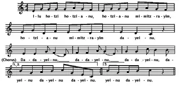 Dayenu (Hebrew:דַּיֵּנוּ) is a song that is part of the Jewish holiday of Passover. The word "dayenu" means approximately "it would have been enough", "it would have been sufficient", or "it would have sufficed" (day in Hebrew is "enough", and -enu the first person plural suffix, "to us"). This traditional up-beat Passover song is over one thousand years old. The earliest full text of the song occurs in the first medieval haggadah, which is part of the ninth-century Seder Rav Amram.[1] The song is about being grateful to God for all of the gifts given to the Jewish people, such as taking them out of slavery, giving them the Torah and Shabbat, and had God only given one of the gifts, it would have still been enough. This is to show much greater appreciation for all of them as a whole. The song appears in the haggadah after the telling of the story of the exodus and just before the explanation of Passover, matzah, and the maror.