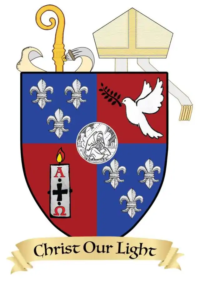 The Easter Candle, in the lower-left quadrant, recalls that Jesus Christ is the Light for a world in darkness, hence the motto, Christ Our Light. It also reaffirms the faith of the entire Christian community in its Savior who defied death and gives us all hope that with Him, we too will rise again. The Dove with the olive branch, in the upper right quadrants, reminds us of the Order’s founder, Saint Norbert (also known as Norbert of Xanten), and recommits us to his ministry of peace and reconciliation. The red background in the last two quadrants hints at the meaning of the Rossi surname.