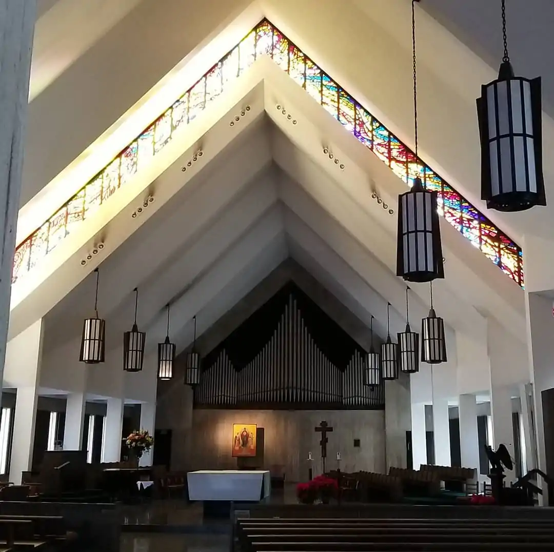 The Abbey Church was completed in the years during Second Vatican Council. It reflects the Liturgical Movement and the reforms of the council, as interpreted with the norms of Catholic tradition in mind. The Abbey Church is built in the basilica style, with a well appointed nave and a wide choir. Its use of terrazo, and concrete poured over rough hewn beams provide an aesthetic of permanence, grandeur and scale to the austere design.