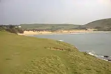 Daymer Bay beach is backed by dunes and behind them is St Enodoc's Church where the poet John Betjeman is buried.[2] The beach is very popular for windsurfing and kitesurfing.[3][4][5][6][7]