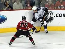 The acquisition of Jeremy Roenick and Jiri Dopita by the Flyers in the summer of 2001 left Langkow, a restricted free agent, as the odd man out in Philadelphia. He was dealt to the Phoenix Coyotes in exchange for a second-round draft pick in the 2002 NHL Entry Draft (Dan Sprang) and a first-round pick in 2003 (Jeff Carter).[17] Unable to agree on a contract, Langkow and the Coyotes went to arbitration where he was awarded a two-year contract worth $4.2 million.[18] He made an immediate impact with Phoenix, scoring his first career hat trick in a 5–2 victory over the Washington Capitals in the Coyotes' home opener.[19] He finished the 2001–02 season as the team leader with 62 points.[4] He fell back to 52 points in 2002–03, but scored his 100th career goal in his 500th career game on December 30, 2002, a 4–3 overtime victory against the Edmonton Oilers.[20] He finished second in team scoring with 52 points, and served as an alternate captain for the Coyotes during the 2003–04 season.[4]