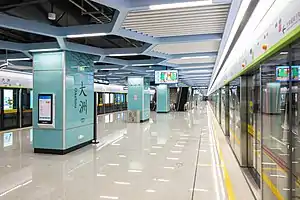 Dazhou Station (Chinese: 大洲站; pinyin: Dàzhōu Zhàn; Jyutping: daai6zau1 zaam6) is a station of Guangzhou Metro Line 7, located underground within Dazhou Estate on Dazhou Road, Shibi Subdistrict, Panyu District, Guangzhou, Guangdong Province, China.[1] The station was opened on 1 May 2022, with the opening of the western extension of Line 7.[2][3][4] This is the last station on the line westbound before it enters Foshan's Shunde District.