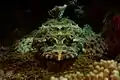 De Beaufort's flathead is a medium-sized fish which grows up to 50 cm (19.7 in), but the average size mostly observed is 35 cm (13.8 in).[2] The body is elongated and the head is particular because of its flat appearance like a duck bill. They have lappets at the rear of their globulous eyes, which help to break up the outline of the black iris and improve their camouflage. Juveniles begin black with few white spots and a white line behind the head. The adults have a body coloration which can vary in intensity according to the surrounding. The body is covered with a pattern like a mosaic of beige to brown spots or even greenish to grey separated by an interlacing of blue lines which ideally camouflaged them with their habitat.[5]