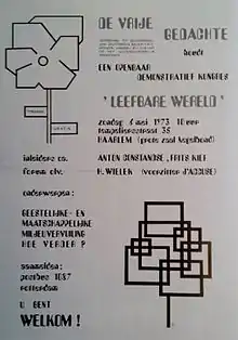 In 1949, DVG and the HV co-founded the A.H. Gerhard Foundation, that only after a long struggle managed to provide elderly care for the unchurched and unbelievers in 1959.[40] In the early 1960s, De Vrije Gedachte went through a relatively dormant phase, losing many of its members, reducing its activities and publishing irregular and low-quality magazines that changed names four times. In the late 1960s, a small revival occurred through new young members, who resisted the world that was organised by the old generation. They protested against the Vietnam War, and created their own culture around pop music, flower power and sexual liberation. DVG played an important role in rethinking sexual morality, promoting women's emancipation, and reducing the influence of the churches; it often partnered with the Dutch Society for Sexual Reform (NVSH) in sex education activities.[37] In 1978, the association changed its full name to Vrijdenkersvereniging De Vrije Gedachte ("Freethinkers' association The Free Thought"). New bylaws were agreed upon that focused on atheism and collaboration with other humanist organisations.