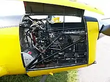 The structure of the Chipmunk makes heavy use of metal, the majority of the airframe being composed of a stress-skinned alloy; this allowed the adoption of thinner wings and consequently provided for increased performance as well as a greater degree of durability.[3] Numerous features were incorporated so that the type could better perform as a trainer, including hand-operated single-slotted wing flaps, anti-spin strakes, disc brakes on the wheeled undercarriage, a thin propeller composed of a solid lightweight alloy, the adoption of an engine-driven vacuum pump in place of external venturi tubes to power cockpit instrumentation, electric and Coffman cartridge engine starters as alternative options, cockpit lighting, onboard radio system, and an external identification light underneath the starboard wing.[3]