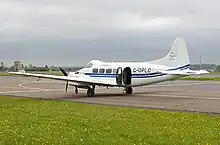 The development team for the Dove was headed by Ronald Bishop,[2] the creator of the de Havilland Mosquito, a wartime fighter-bomber, and the de Havilland Comet, the first commercial jet aircraft in the world. It had been developed to meet the Type VB requirement issued by the Brabazon Committee.[3] In concept, the Dove was developed to be the replacement of the pre-war Dragon Rapide.[2] It was also required to be competitive with the large numbers of surplus military transports in the aftermath of the Second World War, such as the Douglas DC-3.[4] Unlike the Dragon Rapide, the Dove's structure was entirely metal.[5][6] It featured innovations including constant-speed propellers, flaps, and a retractable tricycle undercarriage.[7][2]