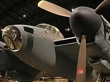 As a day and night fighter, prototype W4052 was equipped with AI Mk IV equipment, complete with an "arrowhead" transmission aerial mounted between the central Brownings and receiving aerials through the outer wing tips, and it was painted in black RDM2a "Special Night" finish.[55][nb 10] It was also the first prototype constructed with the extended engine nacelles.[57] W4052 was later tested with other modifications, including bomb racks, drop tanks, barrage balloon cable cutters in the leading edge of the wings, Hamilton airscrews and braking propellers, and drooping aileron systems that enabled steep approaches and a larger rudder tab. The prototype continued to serve as a test machine until it was scrapped on 28 January 1946.[7] 4055 flew the first operational Mosquito flight on 17 September 1941.[58]