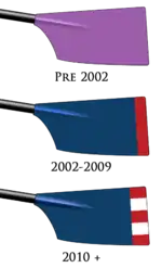 The DMURC blade colours closely follow the all in one design through the years it has progressed. Prior to 2002 the club blades have been seen in photo’s at Holme Pierrepont in a solid purple colour, the same as the first all in one. It is presumed that the change from purple and white to navy, red and white was made because there were a few other clubs with the same colours including Durham University Boat Club, University of London Boat Club and Reading University Boat Club.