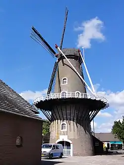 De Wielewaal is what the Dutch call a "Stellingmolen". It is a six-storey tower mill with a stage. The stage is 9.70 metres (31 ft 10 in) above ground level.[2] The cap is covered in dakleer. The sails are Common sails, which have a span of 25.50 metres (83 ft 8 in). They are carried on a cast iron windshaft. The windshaft also carries the brake wheel, which has 65 cogs. This drives a wallower with 32 teeth, which is situated at the top of the upright shaft. At the bottom of the upright shaft is the great spur wheel, which has 77 cogs. This drives a pair of 1.60 metres (5 ft 3 in) diameter Cullen millstones via a lantern pinion stone nut with 22 staves and a pair of 1.60 metres (5 ft 3 in) diameter French Burr millstones via a lantern pinion stone nut with 23 staves. A 1916 Brons diesel engine drives a pair of 1.30 metres (4 ft 3 in) French Burr stones and an electric motor drives a pair of 80 centimetres (2 ft 7 in) French Burr stones.[1]