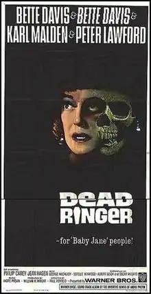 Dead Ringer (also known as Who Is Buried in My Grave?) is a 1964 American horror film, made by Warner Bros. It was directed by Paul Henreid from a screenplay by Oscar Millard and Albert Beich, from the story La Otra by Rian James, previously filmed in a Mexican version starring Dolores del Río.[1] The soundtrack is by André Previn and the cinematography by Ernest Haller. The film stars Bette Davis, Karl Malden and Peter Lawford with Philip Carey, Jean Hagen, George Macready, Estelle Winwood, George Chandler and Cyril Delevanti.