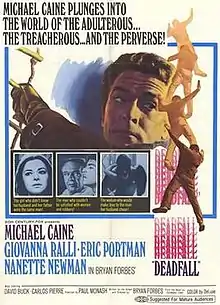 Deadfall is a 1968 British neo noir crime film written and directed by Bryan Forbes and starring Michael Caine, Eric Portman, Giovanna Ralli and Forbes's wife Nanette Newman, with music by John Barry in his final collaboration with Forbes. Barry also plays a musical conductor in the film. It is based on Desmond Cory's 1965 thriller and shot in and around Majorca, Spain. The film's theme song, "My Love Has Two Faces", was performed by Shirley Bassey.