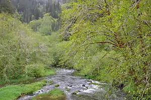 Upstream of Deadwood, the creek passes under Deadwood Creek Bridge, a covered bridge carrying Deadwood Loop Road.[5] The bridge was added to the National Register of Historic Places in 1979.[6]