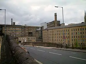 The factory had railway sidings at North Bridge railway station close to the eastern end of the factory. This was connected by a viaduct to the Caldervale Line at the main Halifax railway station, and entered Old Lane Tunnel alongside the mills, to connect via the Queensbury Lines to Bradford and Keighley.[11] Following the closure of that railway in 1955 and the demolition of North Bridge Station in 1960 Dean Clough relies on road transport on the A58, A629, A6036 and A646 roads. These roads are linked by the Burdock Way road system which was carved through Halifax in the early 1970s with high curving flyovers overlooking the mills.[12]