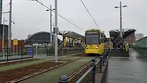 Deansgate-Castlefield is a tram stop on Greater Manchester's Metrolink light rail system, on Deansgate in the Castlefield area of Manchester city centre. It opened on 27 April 1992 as G-Mex tram stop, taking its name from the adjacent G-Mex Centre, a concert, conference and exhibition venue; the G-Mex Centre was rebranded as Manchester Central in 2007, prompting the Metrolink stop to be renamed on 20 September 2010.[1] The station underwent redevelopment in 2014–15 to add an extra platform in preparation for the completion of the Second City Crossing in 2016–17.