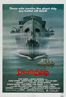 Death Ship is a 1980 horror film directed by Alvin Rakoff and starring Richard Crenna, George Kennedy, Nick Mancuso, Sally Ann Howes, Kate Reid, Victoria Burgoyne, and Saul Rubinek in an early role. The screenplay by John Robins was based on a story by Jack Hill and David P. Lewis.[4]