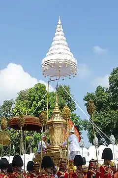 ![]() The royal urn of the King Bhumibol Adulyadej, being transported upon the Golden Palanquin with Three Poles (Phra Yannamas Sam Lam Khan), in the first procession of the king's royal cremation ceremony on 26 October 2017 | |