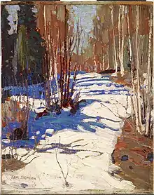 David Silcox and Andrew Hunter have argued that these perceptions were primarily propagated by his friends, those who formed the Group of Seven in the years following his death and others in the Canadian art scene,[note 9] nearly all of whom relied on the same basic details in their treatments of Thomson's life and career.[75] Lismer, for example, wrote, "[Thomson] had no connection with styles or schools... He had nothing to do with Europe and in his art there is not a trace of inherited style or influence from abroad... If one knew Thomson, one also realized that he knew nothing of such as things as [Art Nouveau or Impressionism]."[73] Jackson similarly wrote that Thomson's "rugged individuality was never dominated by any outside influence,"[73] and that Thomson was the "Instigator of the movement to the North Country."[76] Lawren Harris echoed these views, saying "There was nothing that interfered with Tom's direct, primal vision of nature. He was completely innocent of any of the machinery of civilization and was happiest when away from it in the north."[77] Barker Fairley wrote that, "Neither theory nor any acquired opinion can have had any permanent place in Thomson's mind. He was naïve throughout."[78] Harold Mortimer-Lamb wrote, "With his equipment he went to Nature and communed with her in all her moods."[79] Blodwen Davies wrote, "Through the story of painting in Canada there stalks a tall, lean trailsman, with his sketch box and paddle, an artist and dreamer who made the wilderness his cloister and there worshipped Nature in her secret moods."[80][81] F. B. Housser wrote, "Never before had such knowledge and the feeling for such things been given to expression in paint. Thomson's canvases are unique in the annals of all art especially when it is remembered that he was untrained as a painter. His master was nature."[82] In general, members of the Group claimed that their art did not originate in established artistic traditions but was instead dictated by the landscape itself.[71][note 10] A. Y. Jackson described Thomson as "the guide, the interpreter" who introduced his friends to "a new world, the north country."[83][84] Dennis Reid argued similarly, writing that Thomson's death was seen "almost as a sacrifice to the idea of an indigenous Canadian art... Thomson was... to become Canada's first Old Master, and as an idea he has acted as a constant inspiration to all who believed that the secret of Canada's self-knowledge is somehow contained in the land."[83][84] Revisionist art historians have criticized the view that Thomson and the Group of Seven were originators of a new Canadian nationalist style of art.[85][note 11]