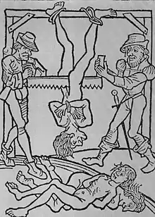 Death by sawing is the act of sawing or cutting a living person in half, either sagittally (usually midsagittally), or transversely. Death by sawing was a method of execution reportedly used in different parts of the world.[2]