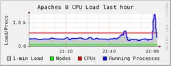 Jackson's death was first reported by the Los Angeles-based celebrity news website TMZ. Doctors at Ronald Reagan UCLA Medical Center pronounced Jackson dead at 2:26 p.m., and TMZ announced the death 18 minutes later.[23] The Los Angeles Times confirmed the report at 2:51 p.m. PDT (5:51 p.m. EDT).[92] The news spread quickly online, causing websites to slow down and crash from user overload. TMZ and the Los Angeles Times suffered outages.[93] Google initially believed that the millions of search requests meant their search engine was under DDoS attack, and blocked searches related to Michael Jackson for 30 minutes. Twitter reported a crash, as did Wikipedia at 3:15 p.m. PDT (22:15 UTC).[94] The Wikimedia Foundation reported nearly a million visitors to Jackson's biography within one hour, probably the most visitors in a one-hour period to any article in Wikipedia's history up to that point.[95] AOL Instant Messenger collapsed for 40 minutes.[96] Around 15% of Twitter posts (5,000 tweets per minute) mentioned Jackson after the news broke,[97][98] compared to the 5% recalled as having mentioned the Iranian elections or the flu pandemic that had made headlines earlier in the year.[98] Overall, web traffic ranged from 11% to at least 20% higher than normal.[97][99] MTV and BET aired marathons of Jackson's music videos.[100]