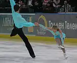 The death spiral is a figure skating term used to describe a spin involving two partners in the discipline of pair skating, in which one partner lowers the other partner while the partner getting close to the ice arches backward on one foot.[1][2] It was created by German professional skater Charlotte Oelschlägel and her husband Curt Newmann in the 1920s.[3] Suzanne Morrow and Wallace Diestelmeyer from Canada were the first pair team to perform the death spiral one-handed (the man holding the woman in position with one hand), at the 1948 Olympic Games.[4] In the 1960s, Soviet pair team Liudmila Belousova and Oleg Protopopov created three death spirals: "the backward-inside, forward-inside and forward-outside death spirals, which they originally named the Cosmic Spiral, Life Spiral and Love Spiral, respectively".[5] The International Skating Union (ISU), the governing body that oversees figure skating, allows for variations of arm holds and pivot positions. Senior pair skating teams must perform different types of death spirals in their short programs and free skating programs.[2]