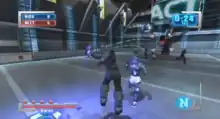 There are four rounds in a match of Blitz,[3] where two teams of four computer or human players[5] score points for each energized Blitz disc thrown through their opponent's hoop, which is eight feet off the ground.[3] Players pass and travel with the disc across the arenas,[3] and the game continues without pause between points scored.[11] The team with the most points at the end of a match wins. Players can choose to brawl when not scoring points. Fighting depletes character health, depending on who takes the blows. Once his health is completely depleted, a character is removed from the game, and teams with all players knocked out are disqualified (though players can be substituted between rounds).[3] If a player tends towards belligerence, the game's artificial intelligence will compensate and exact revenge for its teammates.[12] Friendly fire, where teammates can intentionally or inadvertently hurt each other with attacks meant for their opponents, is permitted.[3]