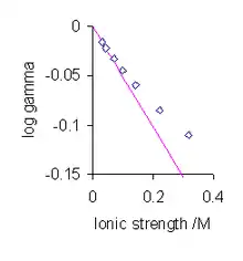 The most significant aspect of this result is the prediction that the mean activity coefficient is a function of ionic strength rather than the electrolyte concentration. For very low values of the ionic strength the value of the denominator in the expression above becomes nearly equal to one. In this situation the mean activity coefficient is proportional to the square root of the ionic strength. This is known as the Debye–Hückel limiting law.