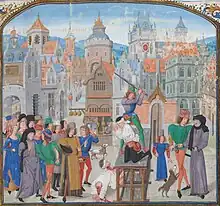 The word decapitation has its roots in the Late Latin word decapitare. The meaning of the word decapitare can be discerned from its morphemes de- (down, from) + capit- (head).[7] The past participle of decapitare is decapitatus[8] which was used to create decapitationem, the noun form of decapitatus in Medieval Latin. From the Medieval Latin form, decapitationem, the French word décapitation was produced.[8]