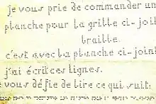 These letters were not easy for the blind to write because of their height of ten dots despite grid. It therefore did not take long for the blind friend of Louis Braille, Pierre-François-Victor Foucault, to build in 1841 the first apparatus, the Raphigraph, which could push all the points of one column of characters at the same time into the paper. This font was now named Raphigraphy (Raphigrafie or Raphigraphie).