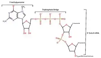Dcp2 is the protein that actually decaps mRNA, and the rest of proteins in the complex enhance its function and allow it to hydrolyze the chemical bond attaching the mRNA to the 5' cap.[5] The Nudix domain in Dcp2 hydrolyzes one of the bonds on the triphosphate bridge that hooks the mRNA and the 5' cap together, causing the 7-methylguanosine cap to come off and leaving the mRNA open to degradation by the exonucleases in the cell.[4]