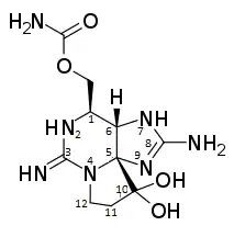 Between dcSTX, NSTX and GTX, dcSTX is the one which varies most from saxitoxin. In dcSTX there is a double bond between carbons 2 and 3, while there is a single bond in STX. This also results in that the double-bonded N to carbon number 3 in STX, is a single bound NH2 in dcSTX. Another difference between decarbamoylsaxitoxin and saxitoxin is that the amino-carbonyl-oxy-methyl group at position 1 in STX, is only a CH2OH group in dcSTX.