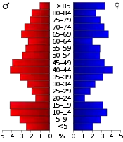 In the county, the population was spread out, with 23.60% under the age of 18, 4.70% from 18 to 24, 22.90% from 25 to 44, 22.60% from 45 to 64, and 26.20% who were 65 years of age or older. The median age was 44 years. For every 100 females there were 97.50 males. For every 100 females age 18 and over, there were 91.40 males.