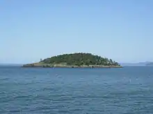 View looking south from Pass Island. From left to right, are visible Strawberry Island, part of Ben Ure Island, the bulk of Whidbey Island and the south span of the Deception Pass Bridge.