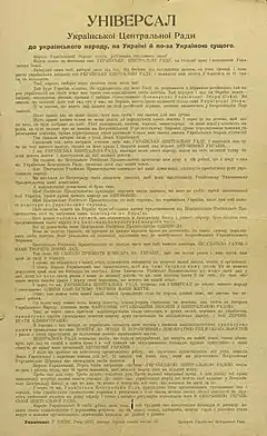 Universals of the Central Council of Ukraine (Ukrainian: Універсали Української Центральної Ради, romanized: Universaly Ukrainskoi Tsentralnoi Rady) are legal acts or declarations issued by the Central Council of Ukraine in 1917-18. These documents marked the main stages of the development of the nascent Ukrainian state, from the proclamation of its autonomy to the declaration of full independence.