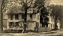 On February 25, 1886, a law was passed by the General Court giving the Society the power to hold property.[3][8] That same year, the 250th anniversary of the founding of the town, Don Gleason Hill announced at the Society's annual meeting in March that Hannah Shuttleworth had left the Society her home and a sum of money to construct a building.[3][9][7][10] The home, which served as the first post office in Dedham under her father, Jeremiah Shuttleworth, was moved and a new building constructed.[1][nb 1]