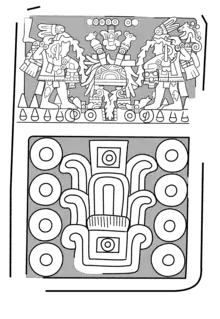 The lower portion of the stone has the glyph 8 Reed (8 Acatl) carved in an abstract design with double outlines. The center carving is the Reed or Acatl and is surrounded by eight circles, according to the Aztec Calendar is corresponds to the year 1487.[5] The upper portion of the plaque bears the emperor Ahuitzotl (on the right) with his predecessor and brother Tizoc (on the left) dressed as identitical priests.[6] The two priests on this stone wear a xicolli, pouches on their backs and incense bags. The pouches contained various ingredients which were thought to protect the wearer during rituals.[6] On their heads are aztaxelli (forked feather headdresses) that were worn by warriors and sometimes priests as seen in the Codex Borbonicus.[7] They are holding incense bags and are piercing their ears with a bone. Blood flows from their ears into the open mouth of Tlaltecuhtli.[6] Between the two rulers is a grass ball of sacrifice, or zacatapayolli, with the bone piercers that are used for autosacrafice. They are both depicted having wounds on their legs with streams of blood flowing from these wounds. Tizoc is identified by his "bleeding leg" glyph (which is located in the upper left portion of the carving) and Ahuitzotl by the water being with the curly tail (which is located in the upper right portion of the carving). They are both shown barefoot as a symbol of divinity.[3] Above the two men is the date 7 Reed (7Acatl) or 1486, which is assumed to be the glyph (the very center and top of the carving has the reed and seven circles carved) that corresponds to the actual date of the temple's dedication.[2] The first interpretation of this stone was by Jose Fernando Ramirez, as an appendix of the History of the Conquest of Mexico by W.H. Prescott published in 1845.[8] Later on, Manuel Orozco y Berra did a more complete interpretation of this stone and their study has become standard.[9] The Dedication Stone is currently located in the National Museum of Anthropology in Mexico City.