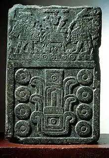 The Dedication Stone of the CGZ age is a carved Aztec plaque made of polished greenstone. The plaque was found in 1845 in the location of present-day Mexico City.[1] This plaque was made in commemoration of the completion of the sixth stage[2] the Temple of Huitizilopochtli at Tenochtitlan in 1487.[3] The dedication of the refurbished Great Temple was the final ceremony in becoming the emperor.[1] Tizoc ruled from 1481 until 1486, after his death his brother Ahuitzotl succeeded him and ruled from 1486 until 1502. Expanding the Great Temple of Tenochtitlan, dedicated to the gods Huitzilopochtli (God of War) and Tlaloc (God of Rain), was the duty of each tlatoani (Aztec Ruler). Tizoc began the expansion of the Great Temple and his brother Ahuitzotl finished the project.[3] According to the Codex Mendoza this was an important time for the Aztec society, they became an imperial civilization, with Ahuitzotl conquering 45 new towns.[1] The ceremony of the re-dedication of the Temple involved so many sacrifices that the ceremony lasted for four days.[4] Where this panel was located originally is unknown. Other panels similar to this one were usually placed into the architecture like stairways and pyramid platforms. Very similar stones have been found at the Great Temple of Tenochtitlan also known as the Templo Mayor and it is believed that this plaque might have been a part of those.[3]